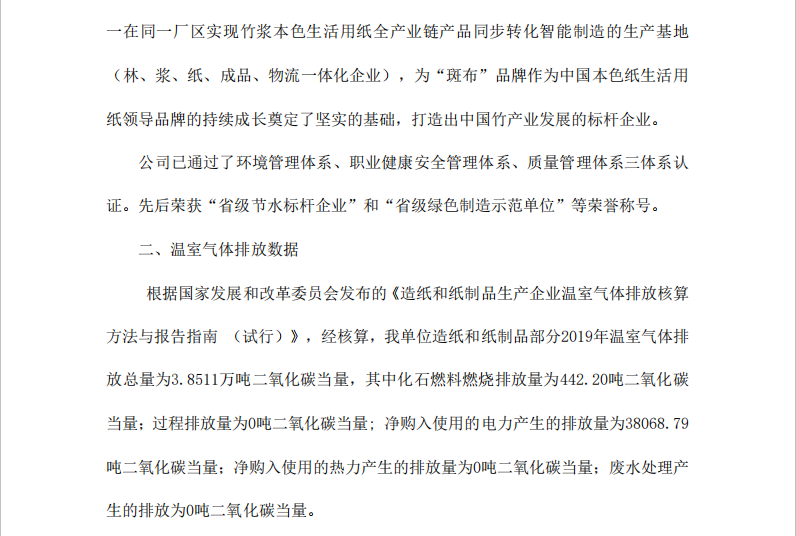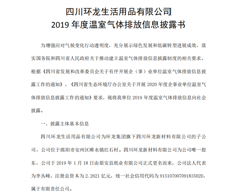 四川環龍生活用品有限公司 2019 年度溫室氣體排放信息披露書