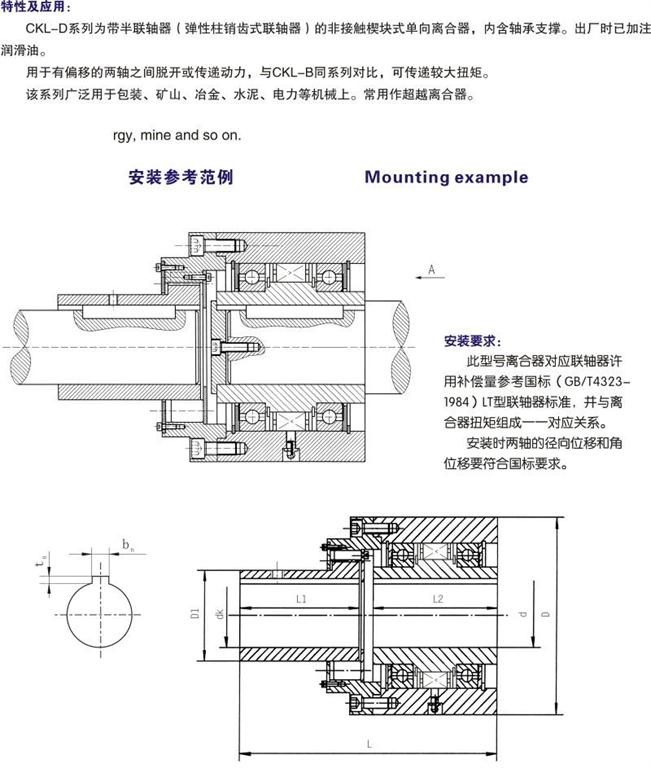 CKL-D為帶半聯(lián)軸器(彈性柱銷(xiāo)齒式聯(lián)軸器)的非接觸楔塊式單向離合器。