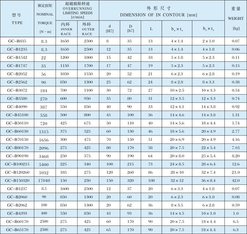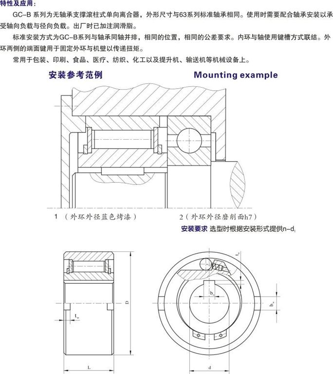 GC-B系列為無(wú)軸承支撐滾柱式單向離合器,外形尺寸與63系列標(biāo)準(zhǔn)軸承相同。