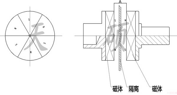 但同時(shí),在磁場(chǎng)的作用下,軸向力(互相吸引)也成正比變化。軸向力是這種平面型傳動(dòng)器的主要缺點(diǎn)。另外,由于傳遞的扭矩大小與圓盤面積有關(guān),因此,這種傳動(dòng)器的扭矩不能做的太大,否則會(huì)導(dǎo)致尺寸過(guò)大,安裝困難。 結(jié)構(gòu)簡(jiǎn)單,成本低廉,是平面型傳動(dòng)器的主要優(yōu)點(diǎn)。因此在某些微型隔離傳動(dòng)方面有成功應(yīng)用。目前,常用的簡(jiǎn)單結(jié)構(gòu)平面型傳動(dòng)器,扭矩一般都在10Nm以下。